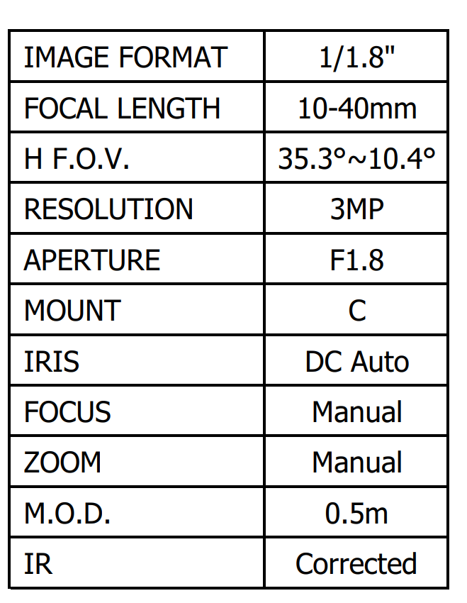 1/1.8" 10-40mm F1.8 3 Megapixel C mount Lens, well MT9P001, good for Day and Night Surveillance Images |